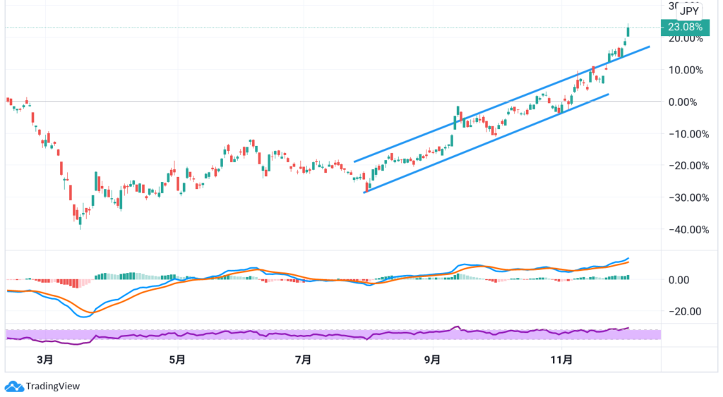 海運が長く上昇基調が続いており、セクターのチャートがきれいな右肩上がりになっています。高値警戒ではありますが、もう少し上げは続きそうです。
