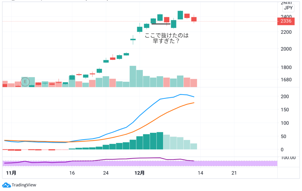 若干、高値圏にいるように見えるので、また上昇基調が始まった後に入るのが良いかな?と思います。