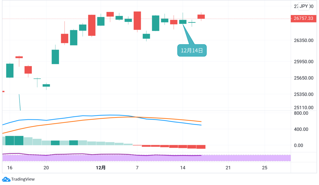 ということで12月15日は下落をしたものの、12月16日は上昇した・・・チャートの形だけで未来を予想するのは難しいですね。