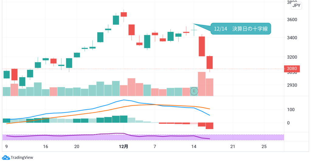 神戸物産の12/13から形は怪しかったですが、12/14も同じく十字線、そして12/15からは下落スタートとなりました。いい決算だったので、個人的には底確認後に買いたいな、と思っています。
