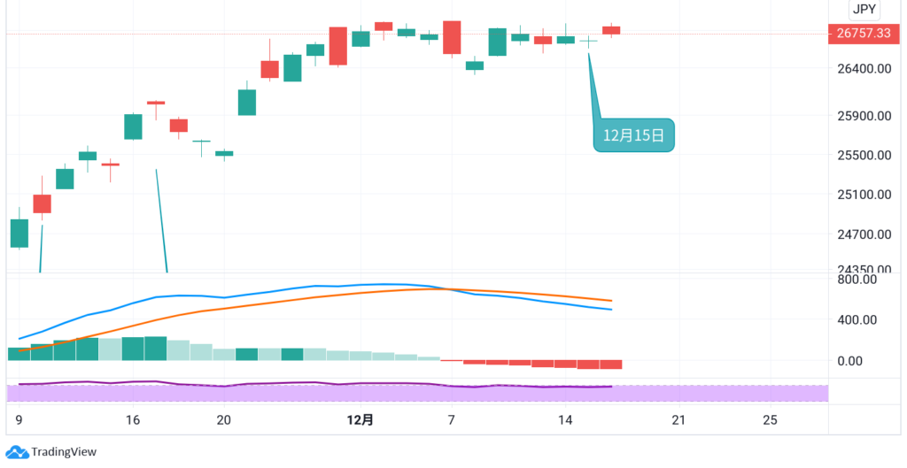 日経平均のチャートの形だけを見ると神戸物産の下落前日と同じ形をしているので、かなり警戒度高めとなりました。記事を書いているのは12/16、15日時点では下に行くと思ったのですが、上に跳ね上がってわからないものです。