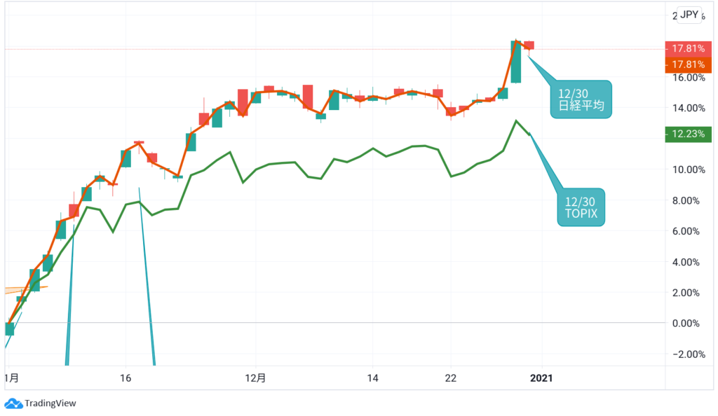 12月30日においても、日経は−0.45%、TOPIXは-0.8%とTOPIXの方が大きく下落しています。
