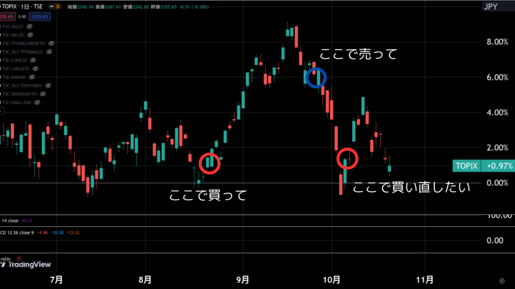 さて、そんな状況で8月、9月を過ごしたわけです。この間にTOPIXはボラティリティ高く上下に動きました。含み益が爆発的に伸びたな〜と見た記憶があるのですが、気がつけばもとに戻っており、利確タイミングを逃した・・・と後悔をしたわけです。