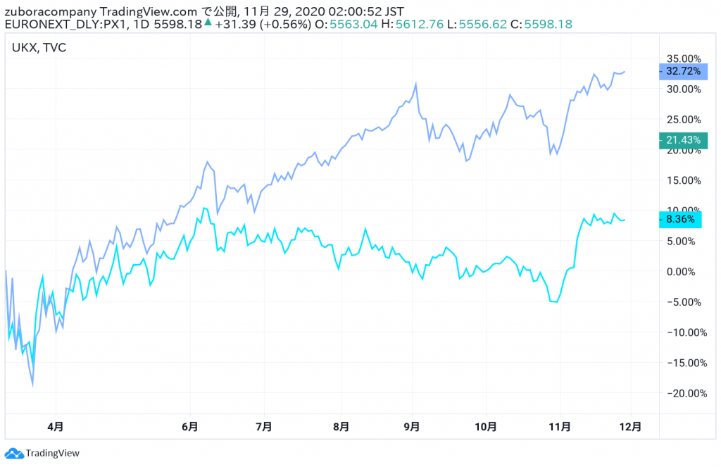 皆さんご存知の通り、SP500はそもそも常に右肩上がり、FTSEは暴落後横に停滞するも、結局米国大統領選挙を契機に右に跳ね上がったのでした。