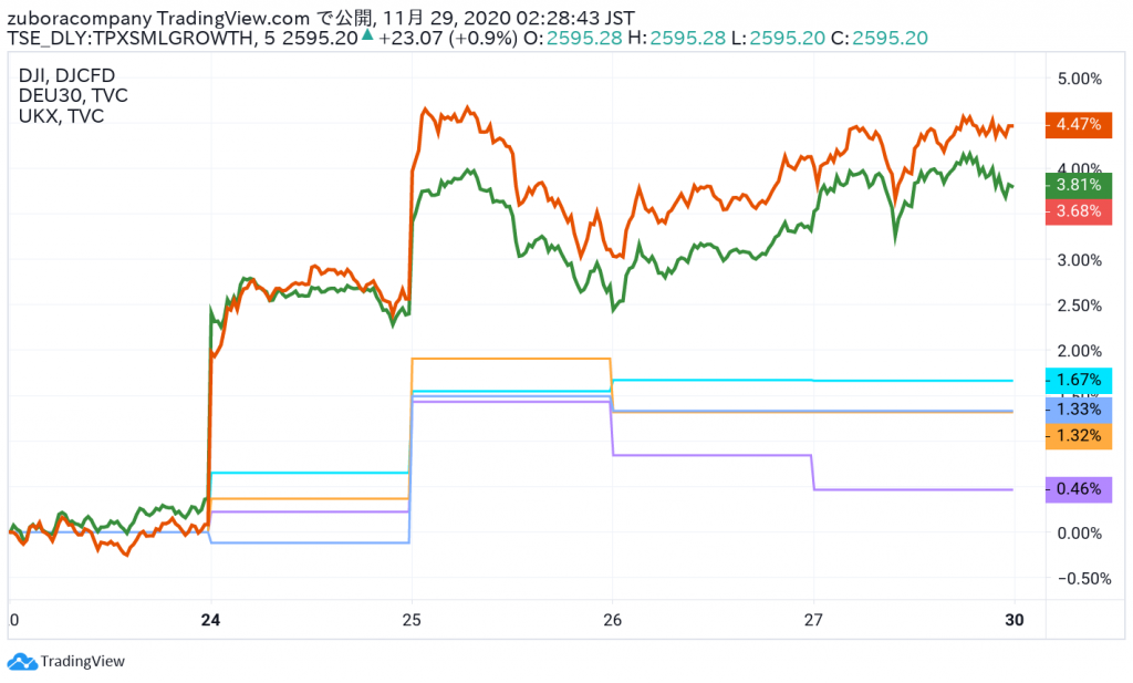 11月は米国大統領選挙、ファイザー、さらにアストラゼネカもワクチンの効果を発表し、ガンガン株価が上昇しています。ファイザー契機でセクターローテーションという単語が株関連のニュースサイトで騒がれ、実際に今まで落ち目だった業界の株価が急上昇しました。