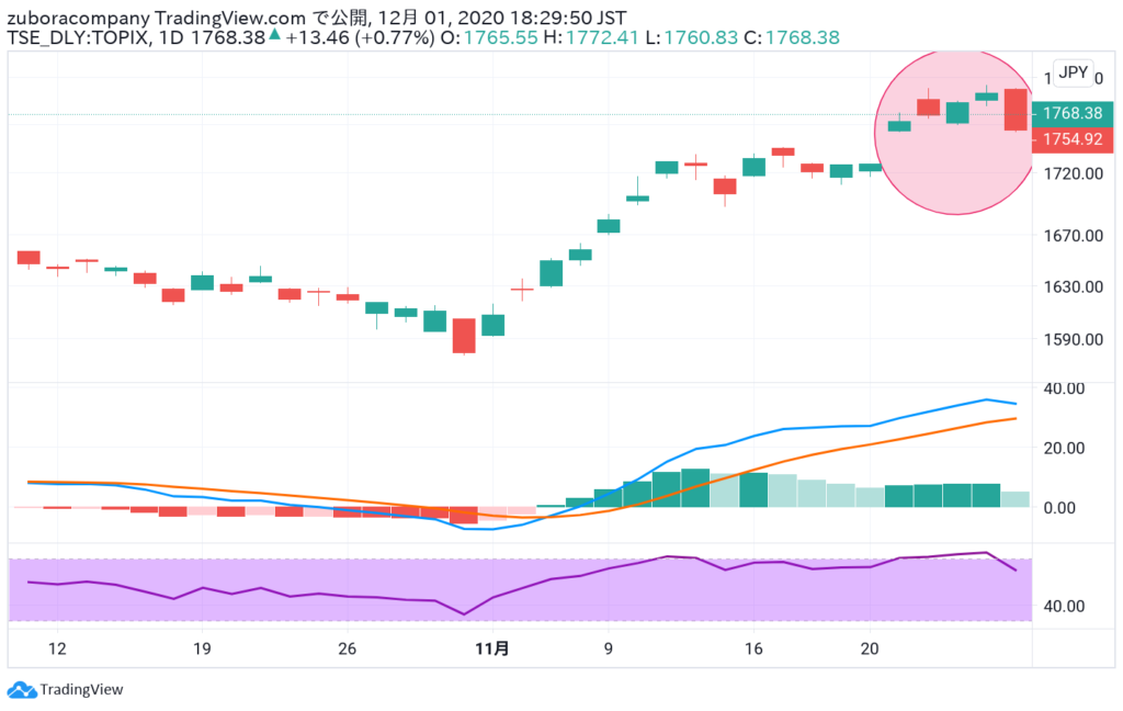 11/30(月)は日経・TOPIX下落。特にTOPIXについては、4日分の上昇幅を飲み込んでおり、かなり警戒心を高めていましたが、本記事を記載している12/1(火)現在といえば、日経はド派手な上昇を見せたのでした・・・とはいえ、Toixの動きは継続して怪しいです。